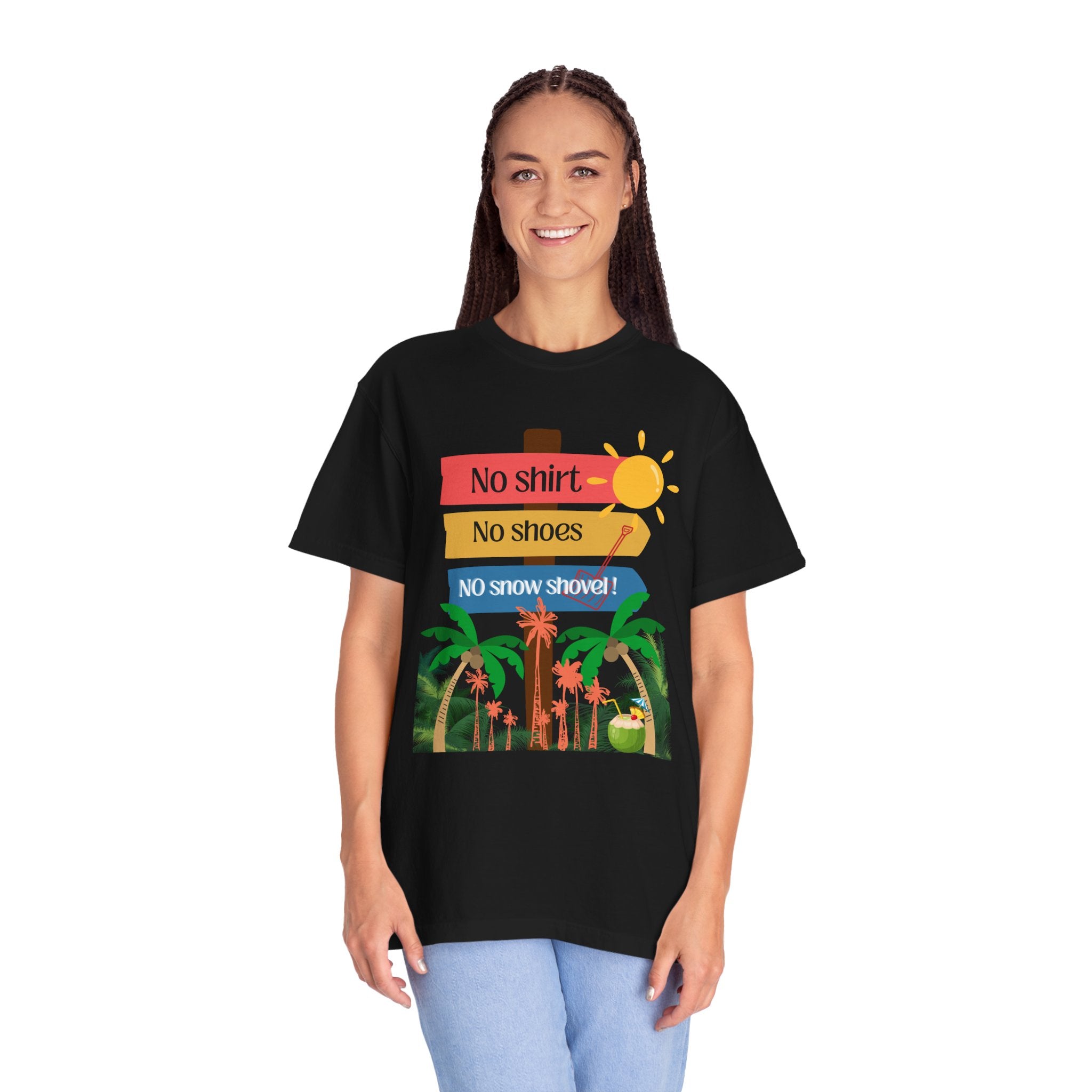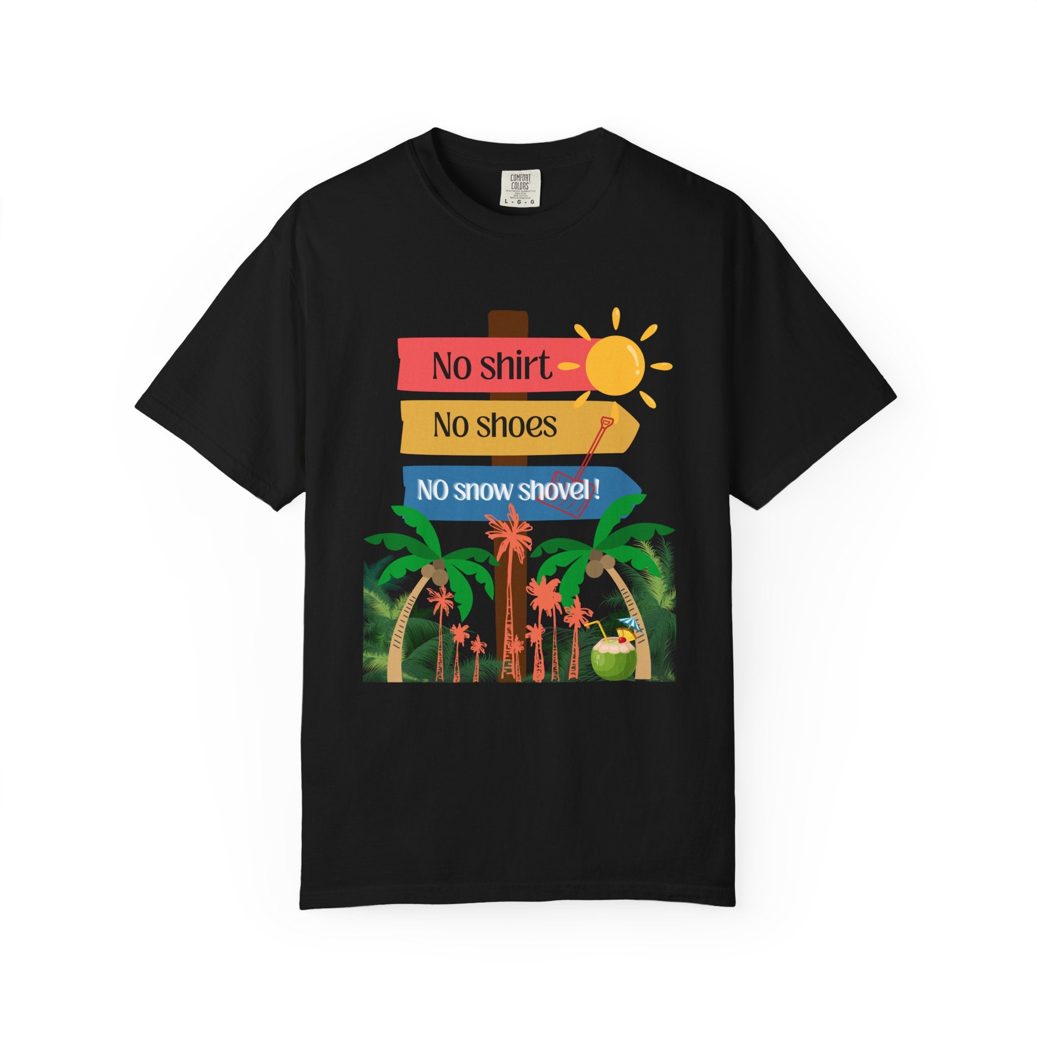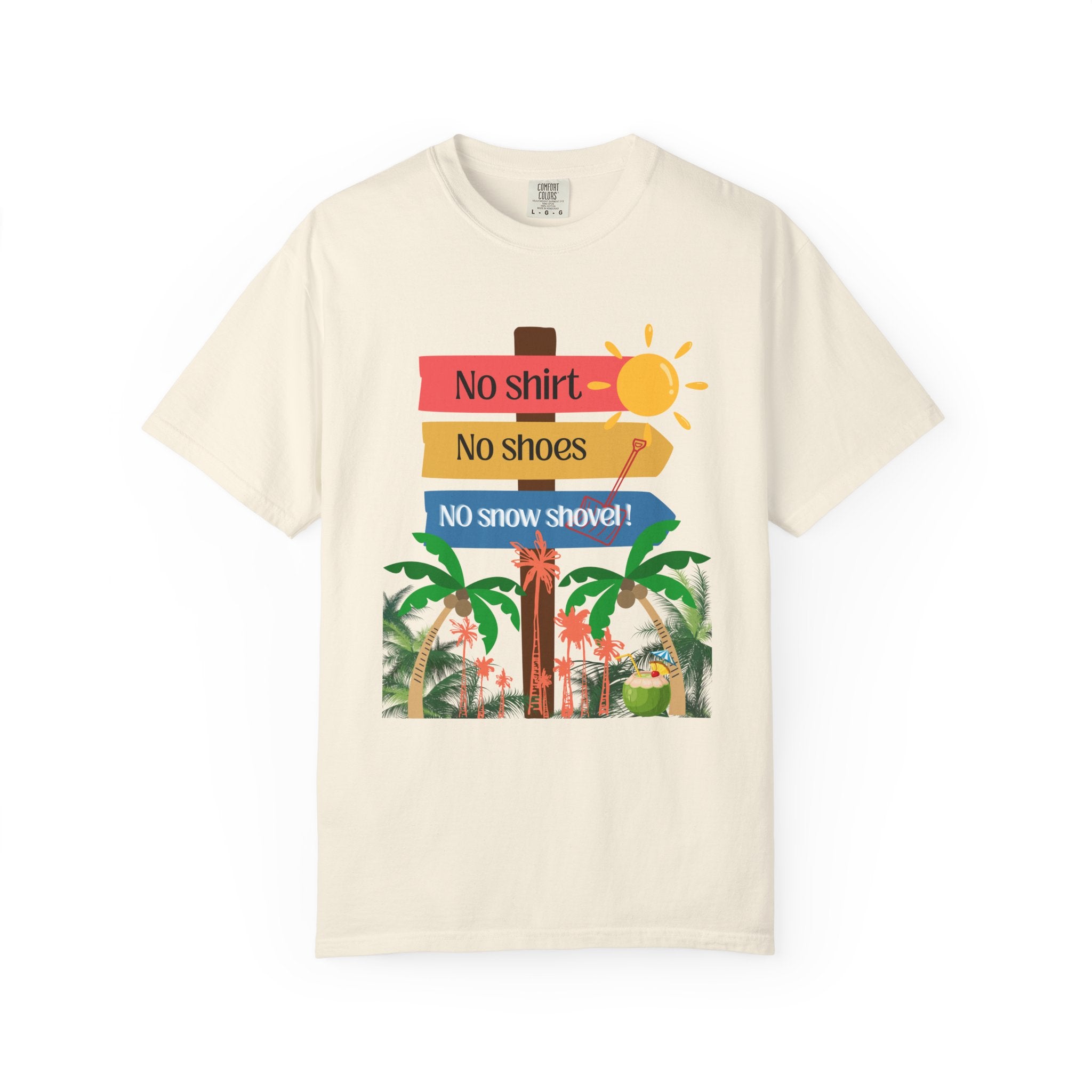 This heavyweight garment-dyed tee brings that slow, sun-drenched afternoon to whatever day you choose. A relaxed-fit cotton shirt with a soft, lived-in color and a cheerful tropical print — directional boards reading “No shirt / No shoes / NO snow shovel!” framed by palm silhouettes, surf details, and a bright sun. It settles lightly on the shoulders and wears in beautifully thanks to pre-shrunk, ring-spun cotton and garment dyeing that gives each shirt subtle character. Wear it when you want to shrug off winter-thinking and lean into sand-between-toes vibes, backyard barbecues, or island-daydreaming drives.