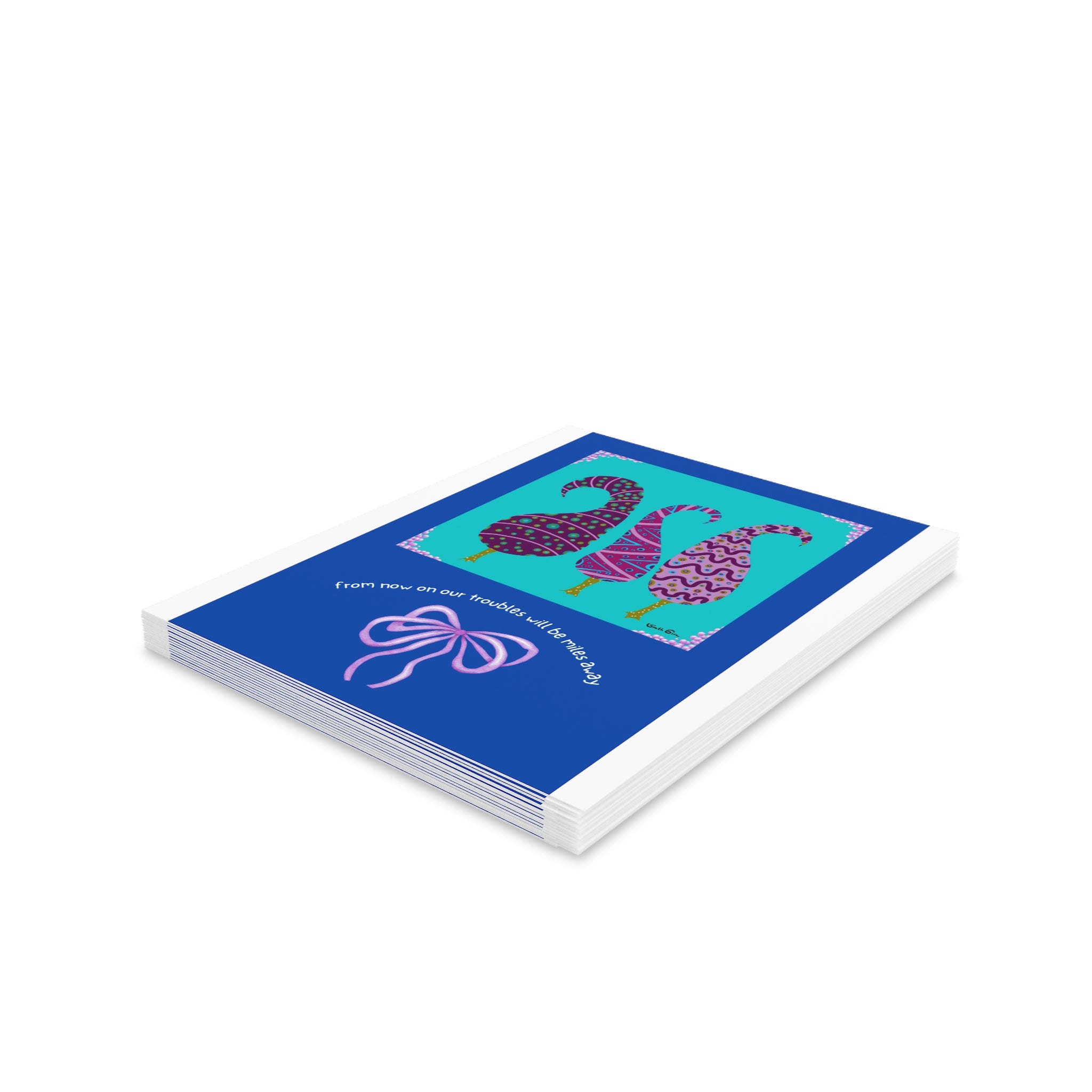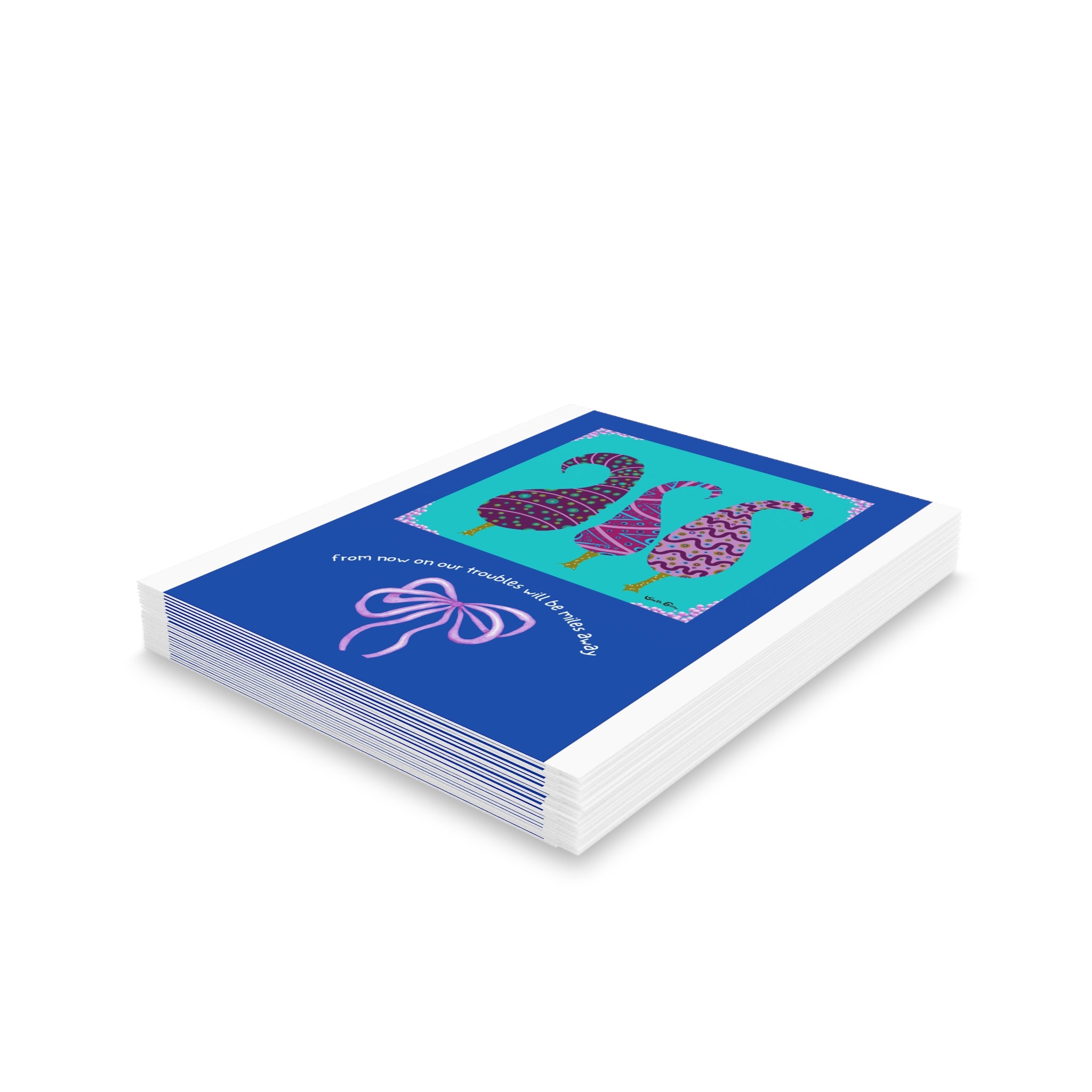 Slip this set of holiday greeting cards into your seasonal rituals and let a simple phrase carry the warmth. Each card reads “From now on our troubles will be miles away,” printed in vivid color on a soft matte surface that invites a slow, deliberate touch. Tuck a short note inside, address the included white envelope, and send a small pocket of optimism to friends who need a reminder that brighter days are ahead. These cards sit well on a mantel among twinkling lights, stacked on a cozy kitchen table waiting for handwriting, or slipped into a care package for someone starting a new chapter. They speak gently to anyone who collects little gestures of comfort and connection during the holidays and winter gatherings.